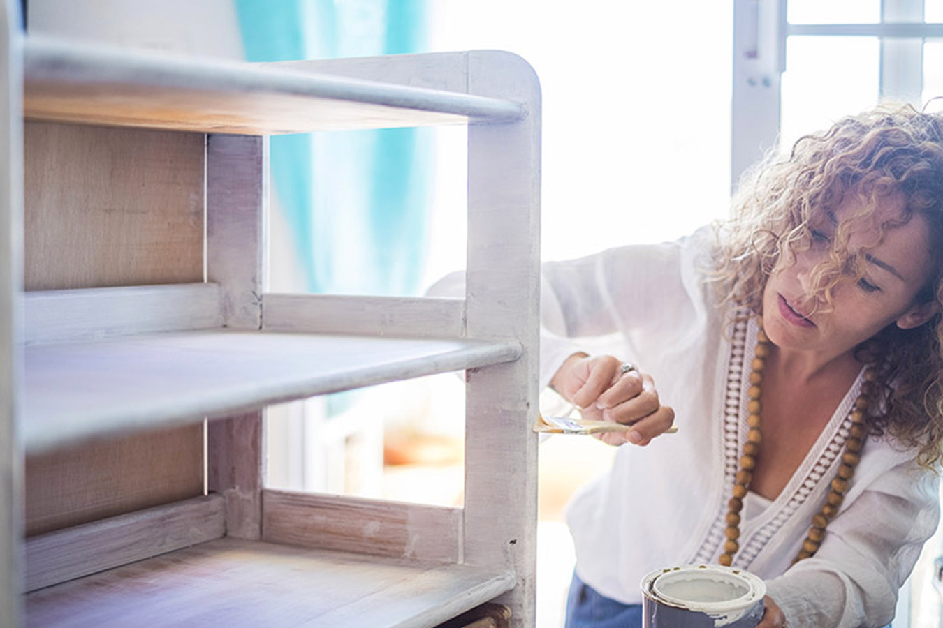 Do przemalowania mebli na biało można wykorzystać wałek z gąbki oraz farbę kredową, akrylowa, olejną czy renowacyjną.