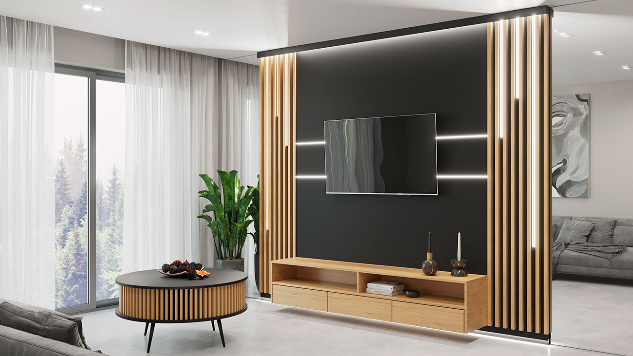 Zabudowa RTV do salonu z lamelami – minimalizm w dobrym guście